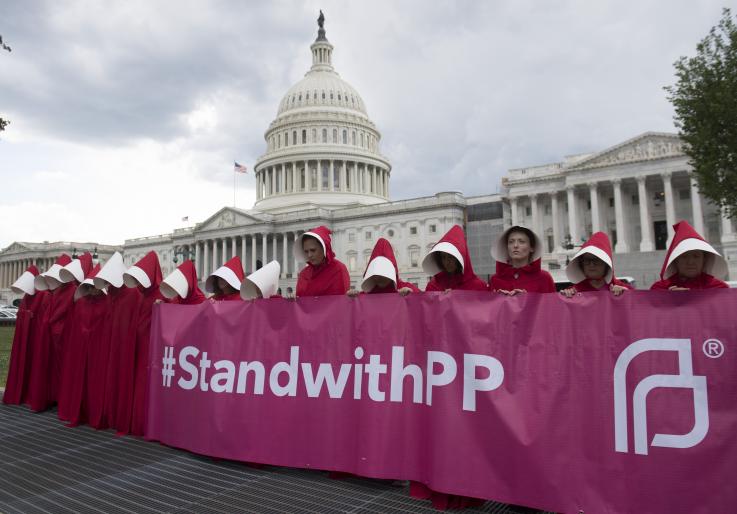 Supporters of Planned Parenthood dressed as characters from “The Handmaid’s Tale,” hold a rally as they protest the US Senate Republicans’ healthcare bill outside the US Capitol in Washington, DC.SAUL LOEB/AFP/GETTY IMAGES