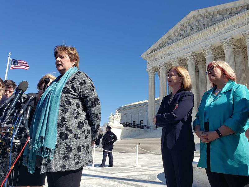 Kathaleen Pittman (left), the administrator of the Hope Medical Group for Women abortion clinic in Shreveport, addresses journalists on the steps of the U.S. Supreme Court on March 4.