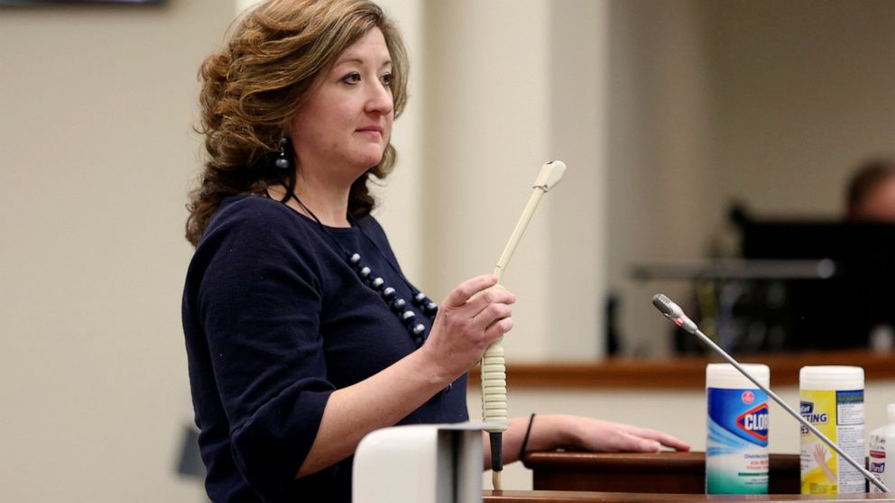 Melissa Anne “Mac” Cunningham-Sereque shows the wand used to do ultrasound on pregnant women during a South Carolina House subcommittee hearing on an abortion bill on Wednesday, Feb. 3, 2021, in Columbia, S.C. The bill would outlaw almost all abortions in the state. (AP Photo/Jeffrey Collins