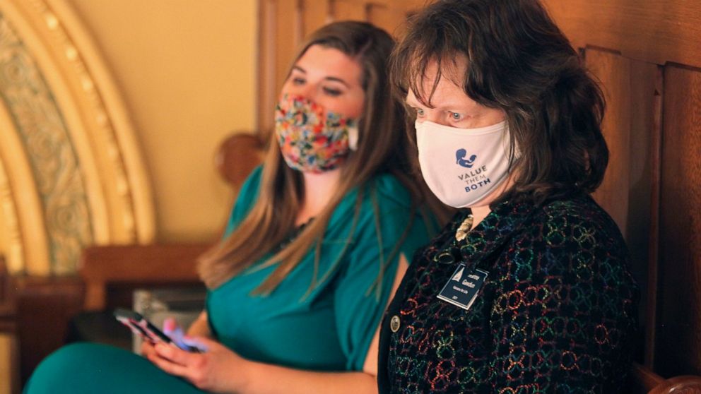 In this photo from Thursday, April 8, 2021, Jeanne Gawdun, right, a lobbyist for Kansans for Life, the most influential anti-abortion group in Kansas politics, watches a state Senate debate from one of its galleries at the Statehouse in Topeka, Kan. She sees an increase in abortions in Kansas in 2020 resulting from Democratic Gov. Laura Kelly’s refusal to ban elective abortions temporarily during the early weeks of the coronavirus pandemic when Republican governors in Oklahoma and Texas did. (AP Photo/John Hanna)