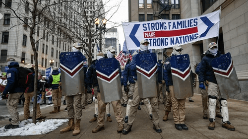 In videos posted to social media, more than a dozen Patriot Front members can be seen marching alongside people demonstrating in support of Chicago’s March for Life. The Patriot Front members wore matching, country club-esque uniforms of blue jackets and pale khakis, as well as hats and face coverings to obscure their identities. Many carried American flags and red-and-blue shields. The group’s banner read “Strong Families Make Strong Nations.