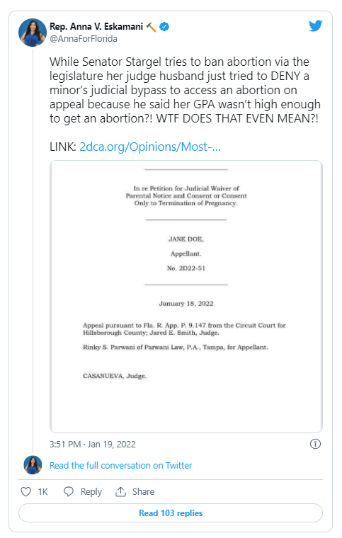 And the judge’s wife is a Florida state senator trying to pass a 15-week abortion ban.