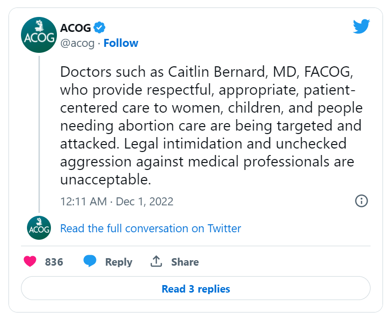 “In some ways, I am grateful that this happened to Dr. Bernard, because I know how excellent she is. I know how cautious and compassionate she is, and I know how careful she is to comply with all of the laws,” she said, adding that the outcome of such a firestorm would likely be far worse for anyone other than a “white, picture-perfect physician.”
