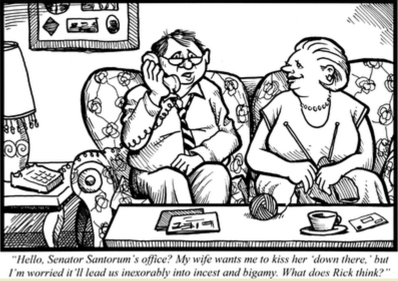 But there’s the rise of Senator Rick Santorum, who opposes using federal dollars for birth control and who even once denounced birth control as “harmful” to women and society: “I don’t think it works. I think it’s harmful to women. I think it’s harmful to our society to have a society that says that sex outside of marriage is something that should be encouraged or tolerated, particularly among the young…” I wonder what Newt thinks about that “sex outside of marriage” line? But I say go for it, Rick, tell the women in this country, including all of those good little Catholic women, that they shouldn’t be taking birth control. Yeah, that’s a clear winner!