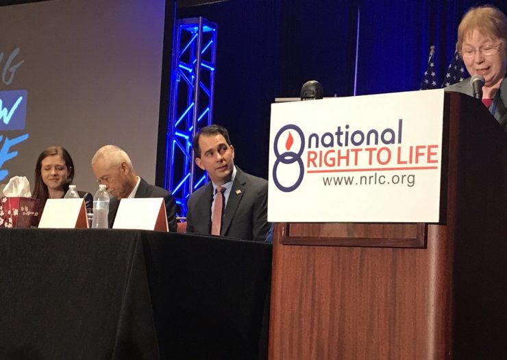 Wisconsin Gov. Scott Walker was among several state anti-choice politicians who appeared at the convention to advertise their anti-choice bona fides.
