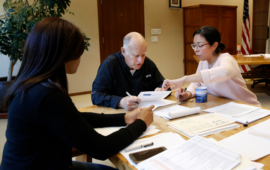 Gov. Jerry Brown reviews a measure with staff members Camille Wagner, left, Graciela Castillo-Krings at his Capitol office, Sunday, Sept. 30, 2018, in Sacramento, Calif. Sunday is the last day for Brown to approve or veto bills passed by the legislature. Brown, who will be leaving office in January, is acting on some on the last pieces of legislation in his tenure as governor. (AP Photo/Rich Pedroncelli)