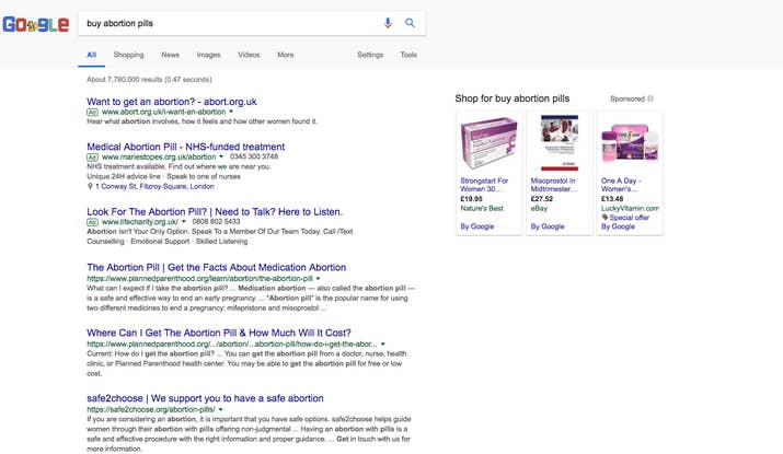 Non-sponsored links for international sexual health group Planned Parenthood; another of the UK’s leading abortion service providers, BPAS; and Women on Web, which provides abortion pills to women in countries where abortion is illegal, appear further down in the results for “buy abortion pills online”.