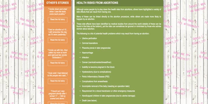 The page offers links to stories from women, all of whom either regretted their abortion or chose not to go through with it and encouraged those reading to do the same, and a “help page” that states abortion could lead to depression, anxiety, low self-esteem, flashbacks, and eating disorders.